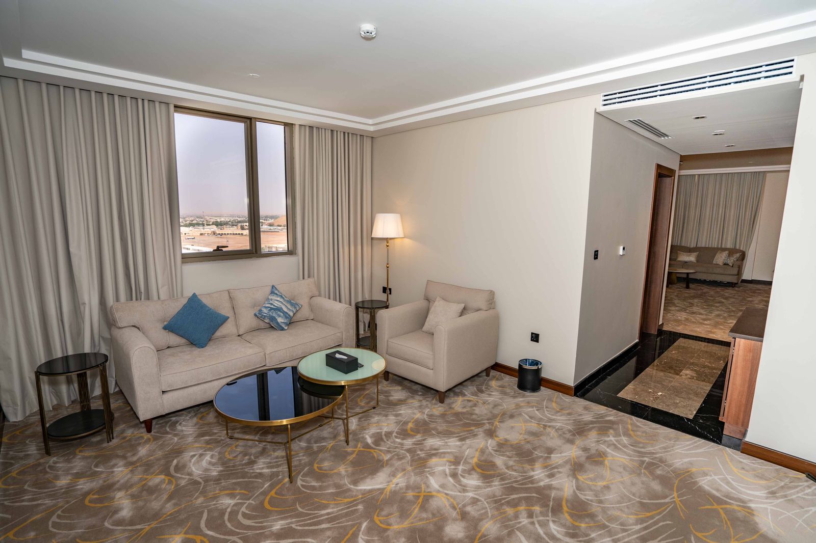 يمزج الجناح بين الأناقة العصرية والدفء الفندقي في مساحة رحبة مثالية للإقامة الفردية أو الزوجية